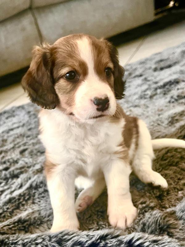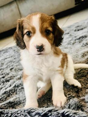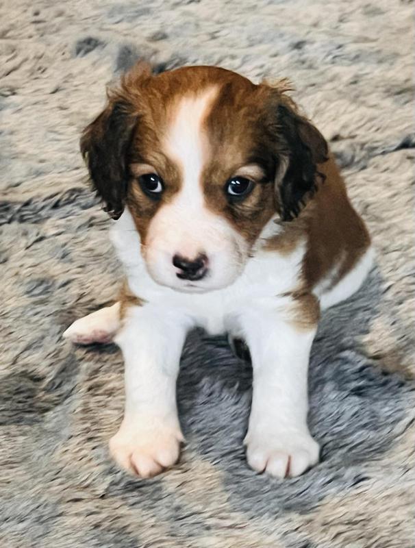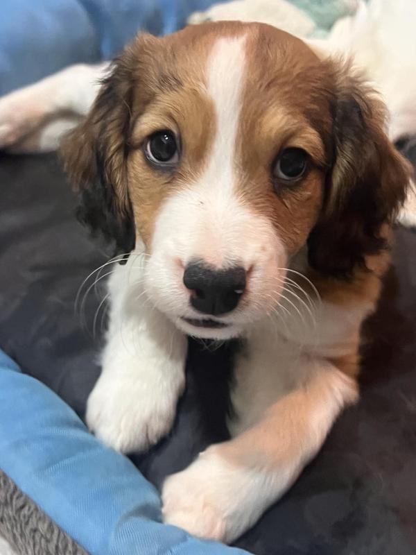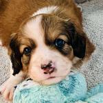Fiyero is a little softie. He's just way to sweet, as you can see that look of love in his eyes. He's is just a mellow kinda guy. The perfect home for our little darling would be just a "go with the flow" family. A family that just wants a true buddy to hang with. Fiyero would be great for a home that likes to travel or just do on or off leash walks. He's the quietest of the litter, (no ear plugs needed) and is just an easy boy. No high energy families need apply. Fiyero is $5100 and will be ready to join his new family mid February 2026.